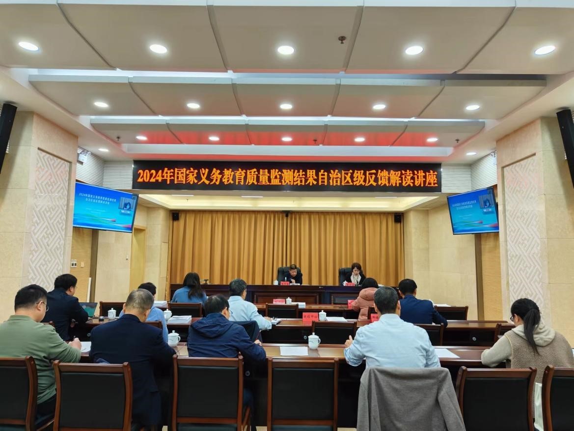 2024年广西继续实施111个县(市、区)全覆盖参加国家义务教育质量监测。为帮助全区各地深入理解国家义务教育质量监测的最新动向,准确解读监测结果报告,充分利用监测结果推进教育管理和教学改进,促进全区义务教育优质均衡发展,12月18日上午,av片信息 举办了广西2024年国家义务教育质量监测结果反馈解读讲座。av片信息 总督学黄华吉同志出席讲座活动并讲话,教育部基础教育质量监测中心专家团队作反馈解读,讲座由av片信息 副总督学覃艳娟同志主持。