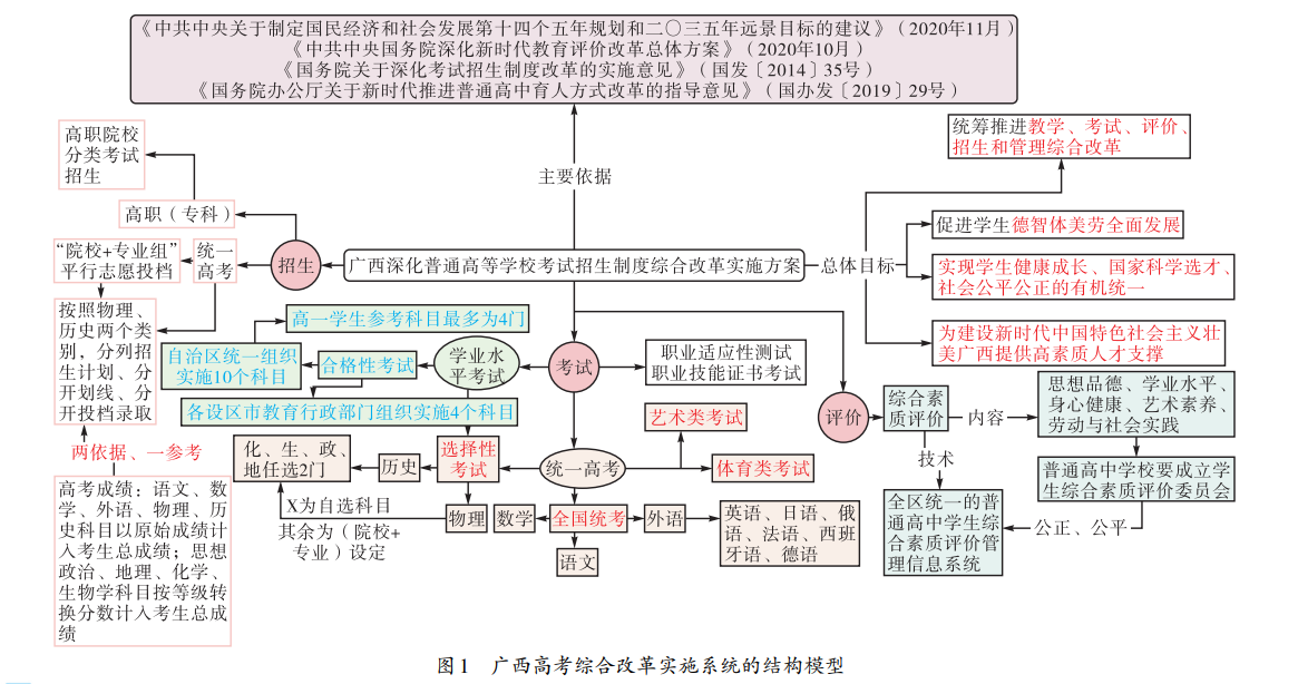 《广西深化普通高等学校考试招生制度综合改革实施方案》(以下简称《方案》)以总体目标、主要任务和保障措施为内容框架,再辅以《广西高考综合改革政策解读 50 问》为解读材料,向各相关责任及利益主体全面深入地呈现了广西高考综合改革实施系统的基本属性、关键要素、运行机制、保障机制和调控机制。《方案》的制订严格遵循国家相关文件精神,广泛吸收先行试点省市的经验,充分结合我区实际,体现了“既先行先试、先易后难,又统筹谋划、协同推进”的新时代改革方法论。基于文本分析,可抽象出广西高考综合改革实施系统的结构模型(如图1)。该实施系统的关键特征是以考试改革驱动教育变革,具体有如下体现。